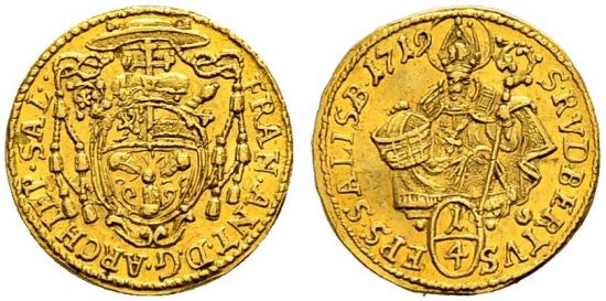 | − | This specimen was lot 3176 in Sincona sale 33 ( | + | This specimen was lot 3176 in Sincona sale 33 (Zürich, October 2016), where it sold for 180 CHF (about US$214 including buyer's fees). The catalog description<sup>[1]</sup> noted, <blockquote>"''Salzburg, Erzbistum. Franz Anton von Harrach, 1709-1727 Vierteldukat 1719. Vorzüglich.'' ([[Germany]], archbishopric of Salzburg, Franz Anton von Harrach, 1709-1727, quarter ducat of 1719. Extremely fine.)"</blockquote> The Archbishopric of Salzburg was an ecclesiastical state between Bavaria and Austria and usually ruled by a Hapsburg client. In the seventeenth century it was blessed with a number of productive silver mines and the prince-archbishop was a prolific issuer of coins, particularly thalers. This type was struck [[Salzburg 1709 1/4 ducat Fr-846|1709]], 1712-19 and 1725. |