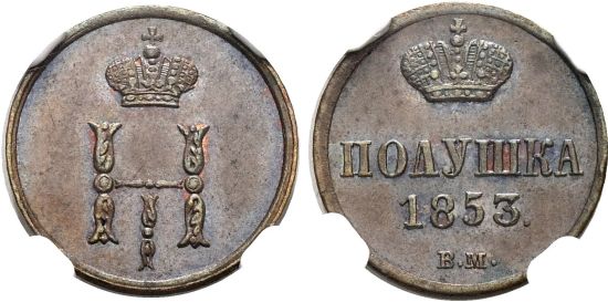 | − | This specimen was lot 1203 in Sincona sale 93 ( | + | This specimen was lot 1203 in Sincona sale 93 (Zürich, October 2024), where it sold for 1,500 CHF (about US$2,079 including buyer's fees). The catalog description<sup>[1]</sup> noted, <blockquote>"[[Russia|RUSSLAND]] Kaiserreich und Föderation, Nicholas I. 1825-1855, Polushka 1853, Warsaw Mint, BM. ''Selten,'' Rare. 5 roubles according to Petrov. 3 roubles according to Ilyin. NGC MS62 BN."</blockquote> This type was struck 1850-55 at Ekaterinburg (mintmark EM) and also Warsaw (shown here) 1850-53. The Ekaterinburg mint made polushkas until 1876. The weight standard given here is from Numista; the 3 g given in the SCWC is wrong. |
