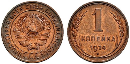 − | This specimen was lot 1041 in Sincona sale 19 ( | + | This specimen was lot 1041 in Sincona sale 19 (Zürich, October 2014), where it sold for CHF 6,000 (about US$7,519 including buyer's fees). The catalog description<sup>[1]</sup> noted, "Kopeck 1924. Brilliant uncirculated." In 1921, having defeated all its internal enemies, the Bolshevik regime resumed the issue of silver coinage of ten kopeks up to a ruble. In 1924, this bronze kopek was added, along with a [[Russia 1924 2 kopeks|two]], [[Russia 1924 3 kopeks|three]] and [[Russia 1924 5 kopeks|five]] kopeks. |
