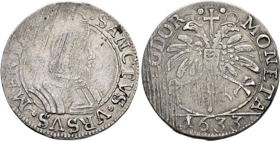 "SCHWEIZ Solothurn, Stadt und Kanton, Dicken 1633, Solothurn. Brustbild des hl. Ursus mit Nimbus nach rechts. Rv. Doppeladler mit Nimben und Kreuz, unten im Abschnitt die Jahreszahl. Von grosser Seltenheit. Sehr schön. Prägeschwäche. Münzmeister Joseph Roggenstil liess bei den Dicken von 1632 den hl. Ursus mit Hüftbild im Harnisch schneiden, was dem Rat offenbar nicht gefiel. Er verlangte deshalb von ihm, die neuen Dicken ab jetzt mit "St. Ursenbrustbild" und der Rückseite mit einem Adler mit Wappen auf der Brust zu schlagen (Ratsmanual 1633, 41). Daraus resultierten offenbar diese neuen Dicken, von denen mindestens drei Stempelpaare bekannt sind. Trotzdem sind diese Münzen sehr rar. (Switzerland, canton of Solothurn, dicken of 1633, Solothurn mint. Obverse: Nimbate St. Ursus right; reverse: nimbate double headed eagle, date in exergue. Of high rarity, Very Fine, Weakly struck. Mintmaster Joseph Roggenstil had the 1632 coins struck with a portrait of St. Ursus in armor (KM 21), which the council evidently did not like. The council therefore ordered that the new coins from now on be struck with a 'bust of St. Ursus' and the reverse with an eagle with a coat of arms on its chest (council manual 1633, 41). This apparently resulted in these new coins, of which at least three pairs of dies are known. Nevertheless, these coins are very rare.)"