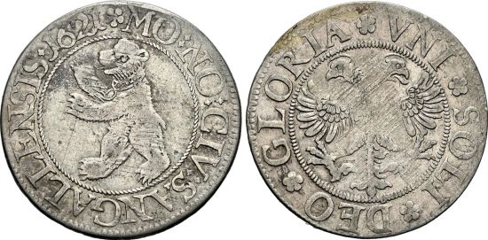 | − | This specimen was lot 4497 in Sincona sale 95 ( | + | This specimen was lot 4497 in Sincona sale 95 (Zürich, October 2024), where it sold for 180 CHF (about US$250 including buyer's fees). The catalog description<sup>[1]</sup> noted, <blockquote>"''SCHWEIZ St. Gallen, Stadt und Kanton, Dicken 1621, St. Gallen. Sehr schön. Leicht justiert.'' ([[Switzerland]], city and canton of [[Switzerland, St.Gallen|St. Gall]], dicken of 1621, St. Gall mint. Very Fine, Minor adjustment marks.)"</blockquote> This type was struck 1618-21. |