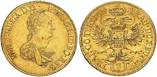 "Ungarn, Maria Theresia, 1740-1780. 2 Dukaten 1765, Karlsburg. Fast vorzüglich. (kingdom of Hungary, Maria Theresia, 1740-80, double ducat of 1765, Karlsburg mint. About extremely fine.)"