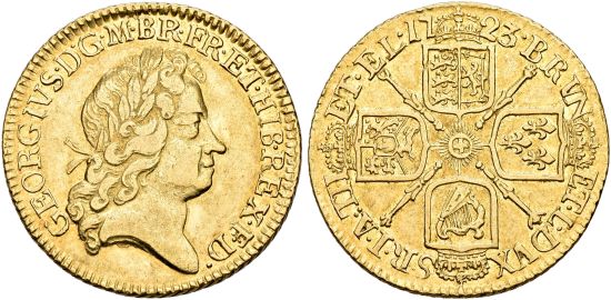 This specimen was lot 1241 in Sincona sale 80 (Zürich, October 2022), where it sold for 3,200 CHF (about US$3,835 including buyer's fees). The catalog description[1] noted, "GREAT BRITAIN | Königreich, George I. 1714-1727. Guinea 1723, London. Fifth laureate head. NGC AU53." This type was struck 1723-27 with no symbol below the bust. There is a variety (KM 559.2) with an elephant below the bust, indicating the use of African gold, which is very rare. Guineas were superseded by sovereigns during the reform of 1817.