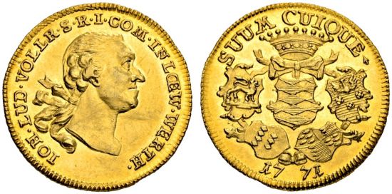 "Löwenstein-Wertheim, Johann Ludwig Volrad, 1730-1790. Dukat 1771, Wertheim. Von grösster Seltenheit. Gutes vorzüglich. (Germany, county of Löwenstein-Wertheim, Johann Ludwig Volrad, 1730-1790, ducat of 1771, Wertheim mint. Of the highest rarity, Good extremely fine.)"