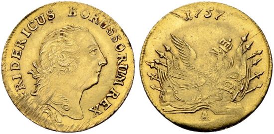 "Brandenburg/Prussia, Friedrich II. 1740-1786. Mittel-Friedrichs dor 1757 A, Berlin. Nackte Büste nach rechts. Rv. Gekrönter Adler zwischen Fahnen und Waffen, darüber die Jahreszahl 1757, im Abschnitt Münzzeichen A. Attraktives Exemplar mit feiner Patina. Vorzüglich-FDC. Justiert und winzige Prüfspur am Rand. (Germany, kingdom of Prussia, Frederick II, 1740-86, middle frederick d'or of 1757, Berlin mint. Obverse: bare bust to right; reverse: crowned eagle rising over piled arms, mintmark dividing date below. Attractive piece with nice patina, Extremely fine-uncirculated, Adjustment marks and minimal test mark on the edge.)"
