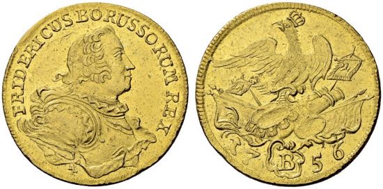 "Brandenburg/Prussia, Friedrich II. 1740-1786. Friedrichs dor 1756 B, Breslau. Brustbild im Harnisch mit Ordensband und Kreuz nach rechts. Rv. Gekrönter Adler auf Schild mit B zwischen Waffen, im Abschnitt die geteilte Jahreszahl 17 - 56. Seltener Jahrgang/Rare date. Sehr schön-vorzüglich. Kleine Kratzer. (Germany, kingdom of Prussia, Frederick II, 1740-86, frederick d'or of 1756, Breslau mint. Obverse: armored bust with sash and cross to right; reverse: crowned eagle with shield between piled arms, mintmark dividing date below. Very fine-extremely fine, Small scratches.)"