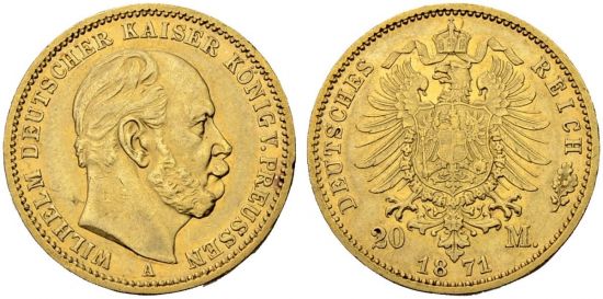 "Preussen, Königreich, Wilhelm I. 1861-1888. 20 Mark 1871 A, Berlin. Fast vorzüglich. (Germany, kingdom of Prussia, William I, 1861-88, twenty mark of 1871, Berlin mint. About extremely fine.)"