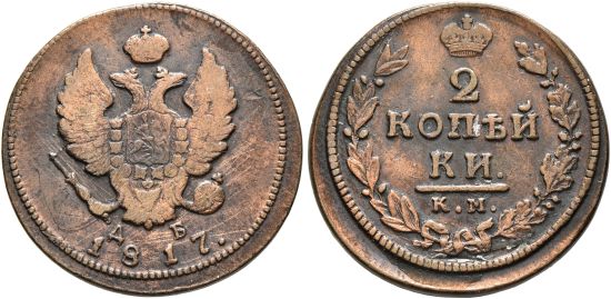This specimen was lot 433 in Sincona sale 78 (Zürich, October 2022), where it sold for 80 CHF (about US$96 including buyer's fees). The catalog description[1] noted, "RUSSIA | Russian Empire and Federation | Alexander I. 1801-1825, 2 Kopecks 1817, Suzun Mint, KM DB. 2 roubles according to Petrov. 1 rouble according to Ilyin. Very fine. Cleaned." This type was struck 1812-30 at Ekaterinburg, St. Petersburg, Izhora and Suzun. The mintages are not known but must have been large, as it is common today. Assayers AM and DB are both recorded for 1817.