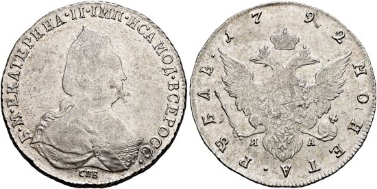 This specimen was lot 347 in Sincona sale 78 (Zürich, October 2022), where it sold for 300 CHF (about US$360 including buyer's fees). The catalog description[1] noted, "RUSSIA | Russian Empire and Federation | Catherine II. 1762-1796, Rouble 1792, St. Petersburg Mint, SPB YaA. 3 roubles according to Petrov. Very fine." The coinage of Russia of the eighteenth century is a confusing and fascinating subject. This type, issued 1783-96, is fairly common altho this is a slightly better date. Catherine the Great began life as an obscure German princess but became czarina after the murder of her husband. The rubles of Peter II were about 28 grams but this type is only 24 grams.