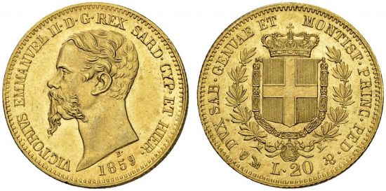 This type was struck at the Turin and Genoa mints 1850-61 during the reign of Victorio Emanuele II of Italy, while he was merely King of Sardinia (1849-61). It is struck to the same standard as the contemporary French twenty francs. It is, however, reasonably common.
