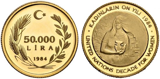 "Republik, seit 1923. 50000 Lira 1984, Ankara. UNO. Dekade der Frau. Selten. Nur 973 Exemplare geprägt. Polierte Platte. FDC. (republic of Turkey, since 1923, 50,000 lira of 1984, Ankara mint, UN Decade for Women. Rare. Only 973 pieces struck, Choice Proof.)"