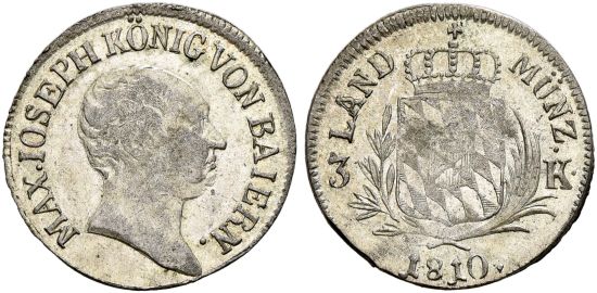 This specimen was lot 2210 in Sincona sale 80 (Zürich, October 2022), where it did not sell. The catalog description[1] noted, "GERMANY | Bavaria, Maximilian IV. (I.) Joseph, 1799-1825. 3 Kreuzer 1810, München. Extremely fine-uncirculated." This type was struck 1807-25. The mintages are not knkown but must have been substantial as the catalog value is low. In the nineteenth century, one thaler was 120 kreuzer, making this coin 1/40 of a thaler. The denomination was terminated in 1868.