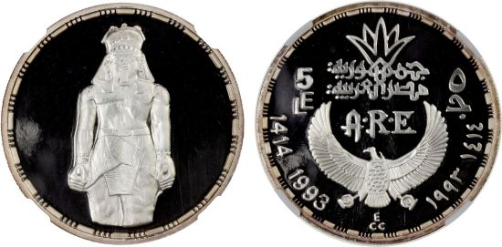 This specimen was lot 2362 in Stephen Album sale 43 (Santa Rosa, CA, May 2022), where it sold for $312. The catalog description[1] noted, "EGYPT: Arab Republic, AR 5 pounds, 1993/AH1414, Ancient Egypt Civilization - Ramses II Statue, NGC graded Proof 69 Ultra Cameo." This NCLT is among dozens issued by the regime in 1993-94 to honor ancient Egyptian culture. Many of the designs were also used on gold fifty pounds.