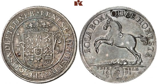 "BRAUNSCHWEIG UND LÜNEBURG, BRAUNSCHWEIG-LÜNEBURG, FÜRSTENTUM, Ernst August, 1679-1698, seit 1662 Bischof von Osnabrück. 2/3 Taler 1691, Clausthal. Feine Tönung, vorzüglich. Aus der Sammlung eines Ingenieurs. Exemplar der Auktion Fritz Rudolf Künker 20, Osnabrück 1991, Nr. 2216. (Germany, duchy of Brunswick-Luneburg-Calenberg, Ernest Augustus, 1679-98, bishop of Osnabrück since 1662, two-thirds thaler of 1691, Clausthal mint. Fine toning, extremely fine.)"