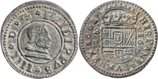 This specimen was lot 2658 in Aureo y Calicó sale 422 (Barcelona, December 2023), where it sold for 25 € (about US$33 including buyer's fees). The catalog description[1] noted, "1663/2. Felipe IV. Sevilla. R. 16 maravedís. Atractiva. MBC+ [attractive, choice very fine]." This denomination was struck 1661-64 at Seville. The sixteen maravedis which appears here was struck only briefly (1660-64) and then abandoned, most likely due to rejection by the populace. The type is also known from Cuenca, Cordoba, Coruña, Granada, Madrid, Valladolid, Segovia and Burgos.
