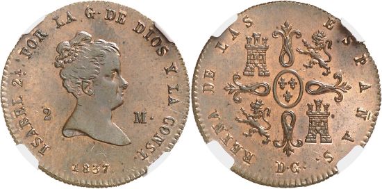 This specimen was lot 396 in Aureo y Calicó sale 448 (Barcelona, March 2025), where it sold for 1,200 € (about US$1,568 including buyer's fees). The catalog description[1] noted, "1837. Isabel II. Madrid. DG (Departamento of Grabado (Engraving Department)). 2 maravedis. Graded by NGC as MS65 BN, no. 5935278-017, as Segovia. Nice. Original luster. Very rare. S/C [uncirculated]. Ex Elariz Collection." Altho this is a product of the Madrid mint, this rare issue is not marked with the Madrid mintmark, being more of a pattern. Similar coins marked "DG" include an 1835 8 maravedis and an 1836 4 maravedis. The Madrid mint was not used for copper at this time, that being the task of Jubia and Segovia.