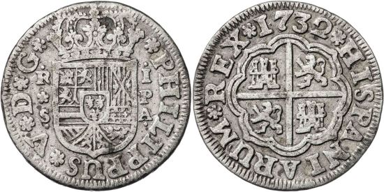 This specimen was lot 2709 in Aureo y Calicó sale 422 (Barcelona, December 2023), where it sold for 32 € (about US$42 including buyer's fees). The catalog description[1] noted, "1732. Felipe V. Sevilla. PA. 1 real. MBC [very fine]." This type was struck at Seville 1731-45 and most dates, including this one, are common. Assayer PA is listed for 1731-36.