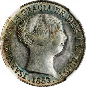 This specimen was lot 72309 in Stack's Bowers Collector's Choice sale (Costa Mesa, CA, October 2021), where it sold for $264. The catalog description[1] noted, "SPAIN. 4 Reales, 1853. Seville Mint (7-pointed star). Isabel II. NGC MS-62. An exceptional treat for any fan of colorfully toned specimens, this nearly-choice example also provides stunning cartwheel luster when rotated back and forth in one's hand." This type was struck in Barcelona, Madrid and Seville 1852-55. Instead of the traditional mintmarks the issues are distinguished by six, seven or eight pointed stars on the reverse (for Madrid, Seville and Barcelona). In 1850, the twenty reales was reduced to 26.91 grams and the copper maravedis dropped in favor of 1/20, 1/10 and 1/5 reales.