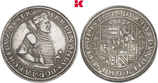 "HABSBURGISCHE ERBLANDE-ÖSTERREICH · RÖMISCH-DEUTSCHES REICH, Erzherzog Ferdinand, 1564-1595. Guldentaler (60 Kreuzer) 1572, Hall. Geharnischtes Hüftbild r. mit Erzherzogshut, mit der Rechten das Zepter schulternd, die Linke am Schwertgriff, unten die Wertzahl 60//Gekröntes, mehrfeldiges Wappen (Ungarn, Böhmen / Kastilien und León / Österreich und Burgund), mit Mittelschild (Tirol), umher die Kette des Ordens vom Goldenen Vlies. Sehr schön-vorzüglich. Exemplar der Auktion Dr. Busso Peus Nachf. 280, Frankfurt/Main 1972, Nr. 1845. (Holy Roman Empire, archduke Ferdinand, 1564-95, guldenthaler or sixty kreuzer of 1572, Hall mint. Obverse: capped and armored half-length bust right, holding a scepter and sword, the value below; reverse: manifold arms of Hungary, Bohemia, Castile, Leon, Austria and Burgundy with the escutcheon of Tyrol, Order chain around, Very fine to extremely fine.)"