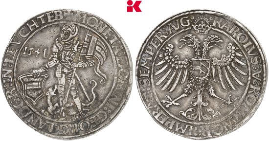 "DEUTSCHE MÜNZEN UND MEDAILLEN · LEUCHTENBERG, LANDGRAFSCHAFT Georg III., 1531-1555. Taler 1541, Pfreimd, mit Titel Karls V. Münzmeister Hans Schulmeister junior. St. Georg mit Schild und Fahne steht v. v., unten der lebende Drache, l. im Feld (gerade am Arm) die Jahreszahl I54I//Gekrönter Doppeladler, auf der Brust zweifeldiges Wappen (Österreich/Burgund). Von großer Seltenheit. Feine Patina, Kratzer auf der Vorderseite, sehr schön-vorzüglich. (Germany, landgraviate of Leuchtenberg, George III, 1531-55, thaler of 1541, Pfreimd mint, struck in the name of Charles V. Obverse: Shield and flag are from the front, below the living dragon, above, the horizontal date; reverse: crowned double-headed eagle, on the chest the impaled arms of Austria and Burgundy. Extremely rare, fine patina, scratches on the obverse, very fine to extremely fine.)"