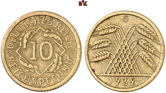 "WEIMARER REPUBLIK. 10 Reichspfennig 1932, G. RR Sehr schön. (Germany, Weimar Republic, ten pfennig of 1932. Very rare, very fine.)"