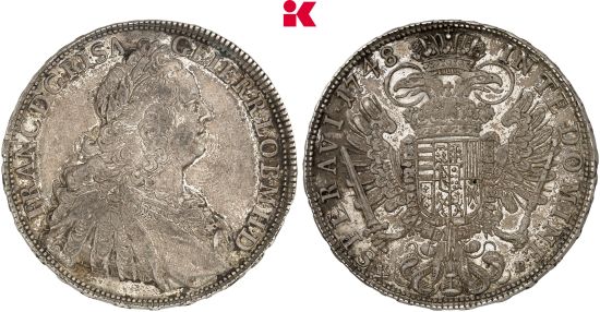 "HABSBURGISCHE ERBLANDE-ÖSTERREICH · RÖMISCH-DEUTSCHES REICH, Franz I., 1745-1765. Reichstaler 1748 KB, Kremnitz. Geharnischtes Brustbild r. mit Lorbeerkranz und umgelegtem Mantel//Gekrönter Doppeladler mit Schwert und Zepter in den Fängen, auf der Brust gekröntes, mehrfeldiges Wappen, umgeben von der Kette des Ordens vom Goldenen Vlies. Von größter Seltenheit. Patina, leicht justiert, fast vorzüglich. (Holy Roman Empire, Francis I, 1745-65, thaler of 1748, Kremnitz mint. Obverse; laureate, draped and armored bust right; reverse: crowned double headed eagle, with sword and scepter in its claws, supports manifold arms, Order chain around. Extremely rare, toned, lightly adjusted, about extremely fine.)"