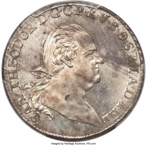 This specimen was lot 30591 in Heritage sale 3081 (New York, January 2020), where it did not sell. The catalog description[1] noted, "German States: Bavaria. Karl Theodor Taler 1793-AS MS65 PCGS. Lustrous and decorated in variegated metallic tones that lay delicately over the surfaces, the central features utterly sharp and giving way to only minute areas of insignificant softness at the peripheries." Charles Theodore became duke of Bavaria in 1777, uniting the two branches of the Wittelsbach dynasty. The Pfalz, or Palatinate, was occupied and annexed to France in 1799 and was not returned to Bavaria until the Congress of Vienna. The Electorate was abolished and Pfalz was merely another province of Bavaria, whose ruler was promoted to king. This type was struck 1778-95 but is rather expensive.