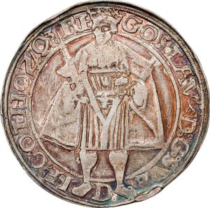 Daveport records four different dalers for 1534: Dav-8691 (standing figure of the king, wearing a cap), Dav-8692 (standing figure of the king, wearing a crown, shown here), Dav-8693 (small caped bust) and Dav-8694 (large caped bust). All are rare. Gustav Vasa is considered the father of Sweden, having led her permanent separation from Denmark.