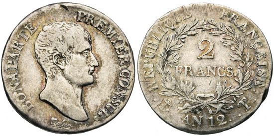 "FRANCE, Consulat (1799-1804), AR 2 francs, an 12T, Nantes. 4.484 p. frappées. Très rare Coups sur la tranche. presque Très Beau. (Consulate of France, 1799-1804, silver two francs of the year 12, Nantes mint. Very rare, rim nicks, about Very Fine.)"
