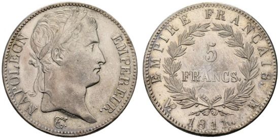 "5 Francs 1811. Marseille Vorzüglich. (empire of France, Napoleon I, five francs of 1811, Marseille mint, extremely fine.)"