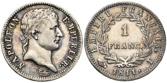 "FRANCE, Napoléon Ier (1804-1814), AR 1 franc, 1811I, Limoges. Très Beau. (empire of France, Napoleon, 1804-14, silver franc of 1811, Limoges mint. Very Fine.)"
