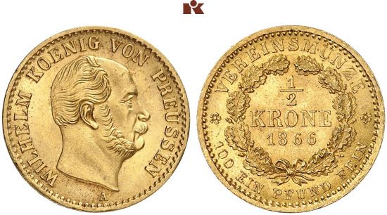"BRANDENBURG-PREUSSEN, PREUSSEN, KÖNIGREICH, Wilhelm I. 1861-1888. 1/2 Vereinskrone 1866, A. GOLD. Vorzüglich-Stempelglanz. Erworben am 18.1.1971. (Germany, kingdom of Prussia, William I, 1861-88, half union krone of 1866. Extremely fine to uncirculated.)"