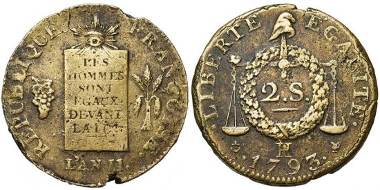 "FRANCE, Convention (1792-1795), Métal de cloche 2 sols à la balance, 1793H, La Rochelle. D/ Table de la Loi entre une grappe et des épis. R/ Valeur dans une couronne et sous une balance portant le bonnet de la Liberté. Défauts de flan sur la tranche. Très Beau. (republic of France, Convention, 1792-95, bell metal double sol of the balance of 1793, La Rochelle mint. Obverse: the table of the law between a bunch of grapes and a blade of wheat; reverse: crowned value under a balance with a liberty cap. Edge defects, Very Fine.)"