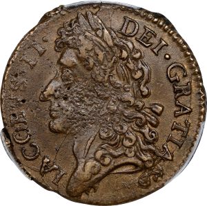 This specimen was lot 42339 in Stack's Bowers NYINC sale (New York, January 2023), where it sold for $630. The catalog description[1] noted, "IRELAND. Gun Money Shilling, 1689 (Jan). Dublin Mint. James II. PCGS AU-58." After James II was deposed as king of Great Britain in the Glorious Revolution of 1688, he fled to France. He landed in Ireland in early 1689 to raise the flag of revolt on behalf of the Catholic population. Lacking bullion to strike conventional coinage, church bells and worn out cannon were melted down to make a series of token coinage in sixpence, shilling, half crown and crown denominations. This coinage is unusual in that it is dated by month and year. It was to be redeemed in silver after the revolt was successful but James was defeated and forced to return to France while the Irish suffered devastation and land confiscations. This type was struck July 1689-April 1690. This coin, tho dated Jan 1689, was actually struck in January 1690; the Julian calendar used at the time had the new year start in March.