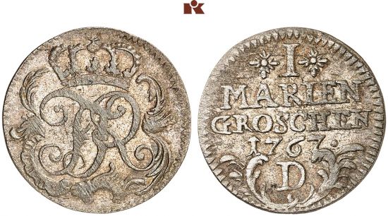 "BRANDENBURG-PREUSSEN, PREUSSEN, KÖNIGREICH, Friedrich II. der Große, 1740-1786. Mariengroschen 1767, D, Aurich. Prägung für die westlichen Landesteile. R Sehr schön. Exemplar der Auktion Kölner Münzkabinett 50, Köln 1990, Nr. 204. (Germany, kingdom of Prussia, Frederick II the Great, 1740-86, mariengroschen of 1767, Aurich mint, struck for the western provinces. Rare, very fine.)"