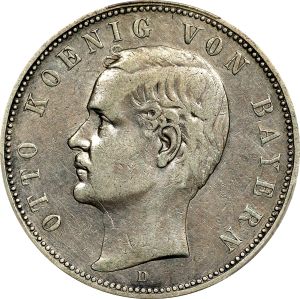 This specimen was lot 72175 in Stack's Bowers Collector's Choice sale (Costa Mesa, CA, May 2023), where it sold for $80. The catalog description[1] noted, "GERMANY. Bavaria. 5 Mark, 1896-D. Munich Mint. Otto. PCGS Genuine--Cleaned, VF Details. The KEY DATE in the series for Otto, this example does exhibit some moderate handling and the noted cleaning, but nevertheless remains a charming representative." This type was struck 1891-1908 and is common. King Otto, traumatized by his combat experience in the Austro-Prussian war, ruled under a regency for his entire reign.