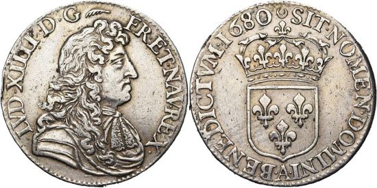 "FRANCE, Royaume, Louis XIV (1643-1715), AR demi-écu à la cravate, 1680A, Paris. 2e émission. D/ B. dr. et cuir. à d., portant une perruque et une cravate brodée. R/ Ecu de France couronné. Rare. Très Beau. (kingdom of France, Louis XIV, 1643-1715, silver half écu of the necktie of 1680, Paris mint, second issue. Obverse: draped and armored bust to right, wearing a wig and an embroidered cravat; reverse: crowned arms of France. Rare, very fine.)"