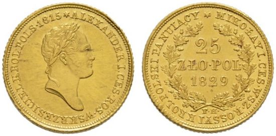 "Nikolaus I. 1825-1855 25 Zlotych 1829. Warsaw Laureate head of the emperor to r. Rev. Value and date in oak leaves. Underneath, F. H. (Friedrich Hunger, Intendant of the Mint). Very rare only 1500 specimens minted. Extremely fine to uncirculated. 18 roubles acc. to Petrov."