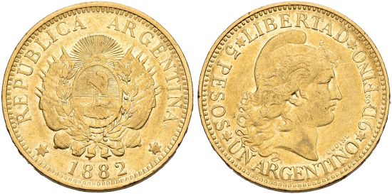 This specimen was lot 2015 in Sincona sale 80 (Zurich, October 2022), where it sold for 400 CHF (about US$480 including buyer's fees). The catalog description[1] noted, "ARGENTINA | Republik | misc, 5 Pesos (1 Argentino) 1882. About extremely fine." This is an example of a type struck 1881-96 from a design by Oudiné, most likely at the Paris mint. Its face value was five pesos and its weight exactly equal to 25 French francs in gold. This coin was formerly scarce until a hoard of several thousand was sold by Stack's in the mid 1990's.