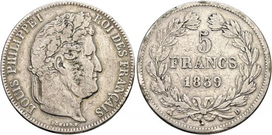 "FRANCE | Kingdom. Louis Philippe, 1830-1848. 5 Francs 1839 D, Lyon. Turm / tour. Sehr selten. Fast sehr schön. (kingdom of France, Louis Philippe, 1830-48, five francs of 1839, Lyon mint, tower privy mark. Very rare, About very fine.)"