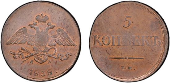This specimen was lot 1395 in Stephen Album sale 47 (Santa Rosa, CA, September 2023), where it sold for $900. The catalog description[1] noted, "RUSSIAN EMPIRE: Nicholas I, 1825-1855, AE 5 kopeks, 1838, Ekaterinburg Mint, Nikolai Alekseev assayer, an attractive mint state example with partial original red mint luster! PCGS graded MS62 BN, ex Joe Sedillot Collection." This type was struck at Ekaterinburg in large quantities 1831-39 and is common in circulated condition.