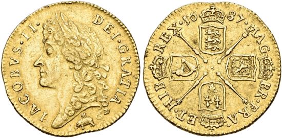 This specimen was lot 1182 in Sincona sale 79 (Zurich, October 2022), where it sold for 7,500 CHF (about US$8,989 including buyer's fees). The catalog description[1] noted, "GREAT BRITAIN | Königreich, James II. 1685-1688. Guinea 1687, London. Second laureate bust, with elephant and castle below. NGC AU53." The first bust was used 1685-86, the second bust was used 1686-88. Both come with or without the elephant and castle below the truncation.