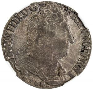 Shown is a twenty sols aux insignes (twenty sous with insignia) struck at the Nantes mint for France in the last years of Louis XIV's reign. The type was struck 1707-08 in substantial numbers but the type is scarce today. When the coin was recalled in 1710 for melting, the government paid only 14 sols each for them. This specimen was lot 1073 in Stephen Album sale 30 (Santa Rosa, CA, January 2018), where it did not sell. The catalog description[2] noted, "FRANCE: Louis XIV, 1643-1715, AR ¼ écu, Nantes, 1708-T, NGC graded AU55." This date is common.