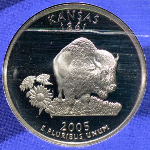 In 1999, the United States mint began a program of commemorative quarters featuring each of the fifty states. Five designs were issued each year 1999-2008. In 2005, the states featured were California, Minnesota, Oregon, Kansas (shown here) and West Virginia. The program was popular enough that it was expanded to include the territories in 2009 and the national parks in 2010.