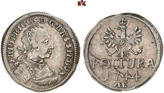 "BRANDENBURG-PREUSSEN, PREUSSEN, KÖNIGREICH, Friedrich II. der Große, 1740-1786. Poltura 1744, AHE, Breslau. Prägung für die Provinz Schlesien. Der Kopf teilt die Umschrift nicht. RR Feine Patina, Stempelfehler, sehr schön +. Exemplar der Auktion Dr. Busso Peus Nachf. 304, Frankfurt/Main 1982, Nr. 895 (Lot). (Germany, kingdom of Prussia, Frederick II the Great, 1740-86, poltura of 1744, Breslau mint, struck for the province of Silesia. The head does not interrupt the obvere legend. Very rare, fine patina, planchet flaws, very fine or better.)"