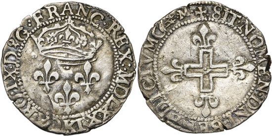 This type was struck 1568-74 at many mints in many varieties yet few survive today. It had a face value of thirty deniers tournois.