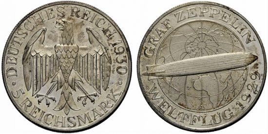"DEUTSCHLAND Weimarer Republik 5 Reichsmark 1930, Berlin. Weltrundflug des Luftschiffs "Graf Zeppelin". Polierte Platte. FDC. (Germany, Weimar Republic, five reichsmark of 1930, Berlin mint, on the world flight of the "Graf Zeppelin," proof.)"