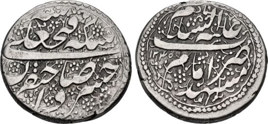 This specimen was lot 6443 in CNG sale Triton XXVII (New York, January 2024), where it sold for $98. The catalog description[1] noted, "Iran. Qajars. Fath 'Ali Shah. As Shah, AH 1212-1250 / AD 1797-1834. AR Rial. Type E. Imam 'alayhi al-salâm Mashhad mint. Dated AH 1245 (AD 1829/30). Fin[e] patina, worn at high points, minor peripheral weakness, edge marks, mount removed. Good VF. Attractive, well centered strike. Very rare. The "Imam" refers to Ali b. Abi Talib, the first Shi'ite Imam, whose shrine is located at Mashhad." This type was struck AH 1242-1246. The rial was superseded by the kran in the 1240's and was not struck after AH 1246.