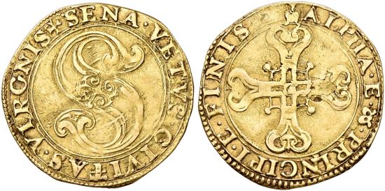 "ITALY | Siena, Repubblica, 1404-1555. Scudo d'oro o. J. (1546-1548). +SENA.VETVS,CIVITAS.VIRGNIS Verziertes grosses S. Rv. ALPHA.E.w.PRINCIPI..E.FINIS Verziertes Kreuz. Von grösster Seltenheit. Sehr schön. (Italy, republic of Siena, 1404-1555, undated gold scudo, ca. 1546-48. Obverse: florid large "S", reverse: floriate cross. Of the highest rarity, Very fine.)"