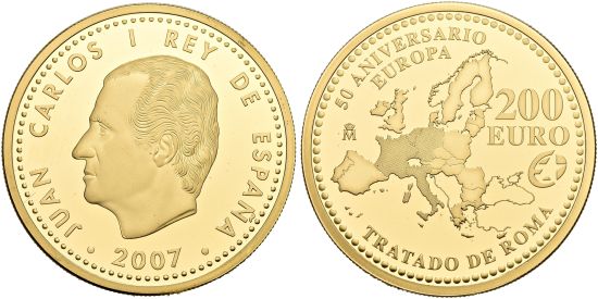 "SPAIN | Königreich, Juan Carlos I. 1975-2014. 200 Euro 2007, Madrid. Auf 50 Jahre römische Verträge. Nur 3'500 Exemplare geprägt. Polierte Platte. Im Originaletui mit Zertifikat. (kingdom of Spain, Juan Carlos I, 1975-2014, two hundred euro of 2007, Madrid mint. On the fiftieth anniversary of the Treaty of Rome. Only 3,500 pieces struck, Choice Proof, In original box with certificate.)"